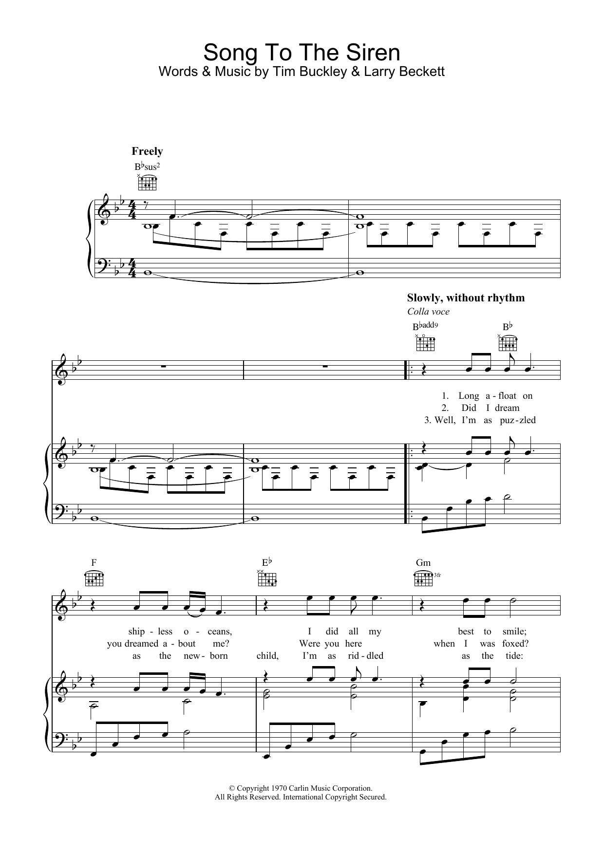 Download or print Tim Buckley Song To The Siren sheet music, chords and digital score arranged for Piano, Vocal & Guitar Chords. This Folk score includes 3 page(s).