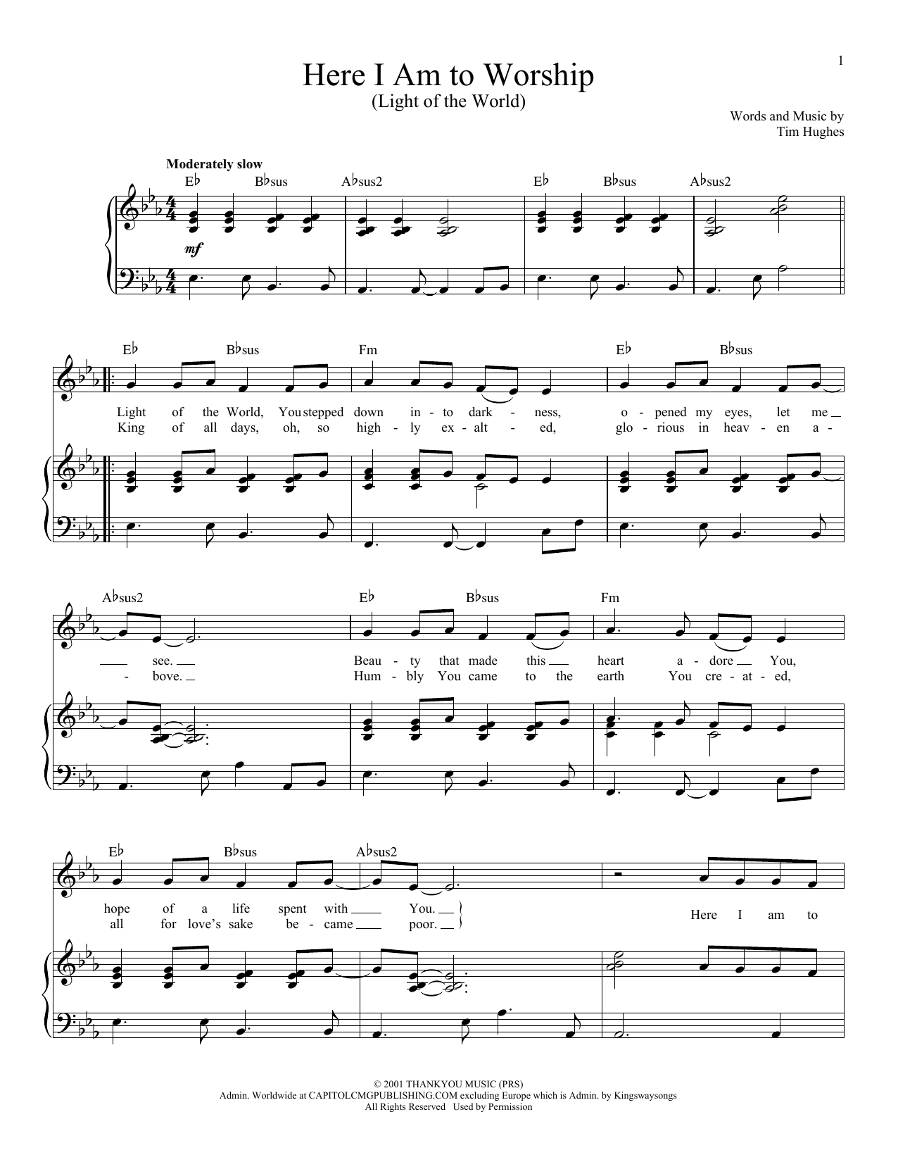 Download or print Tim Hughes Here I Am To Worship (Light Of The World) sheet music, chords and digital score arranged for Piano & Vocal. This Praise & Worship score includes 4 page(s).