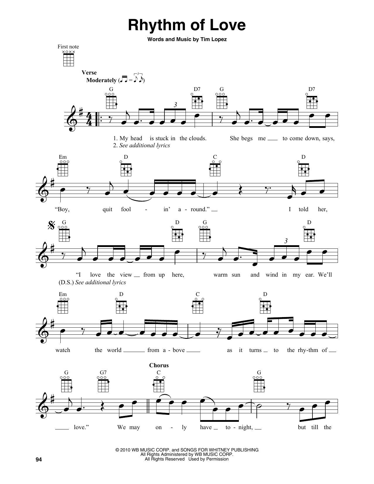 Download or print Tim Lopez Rhythm Of Love sheet music, chords and digital score arranged for Baritone Ukulele. This Pop score includes 3 page(s).