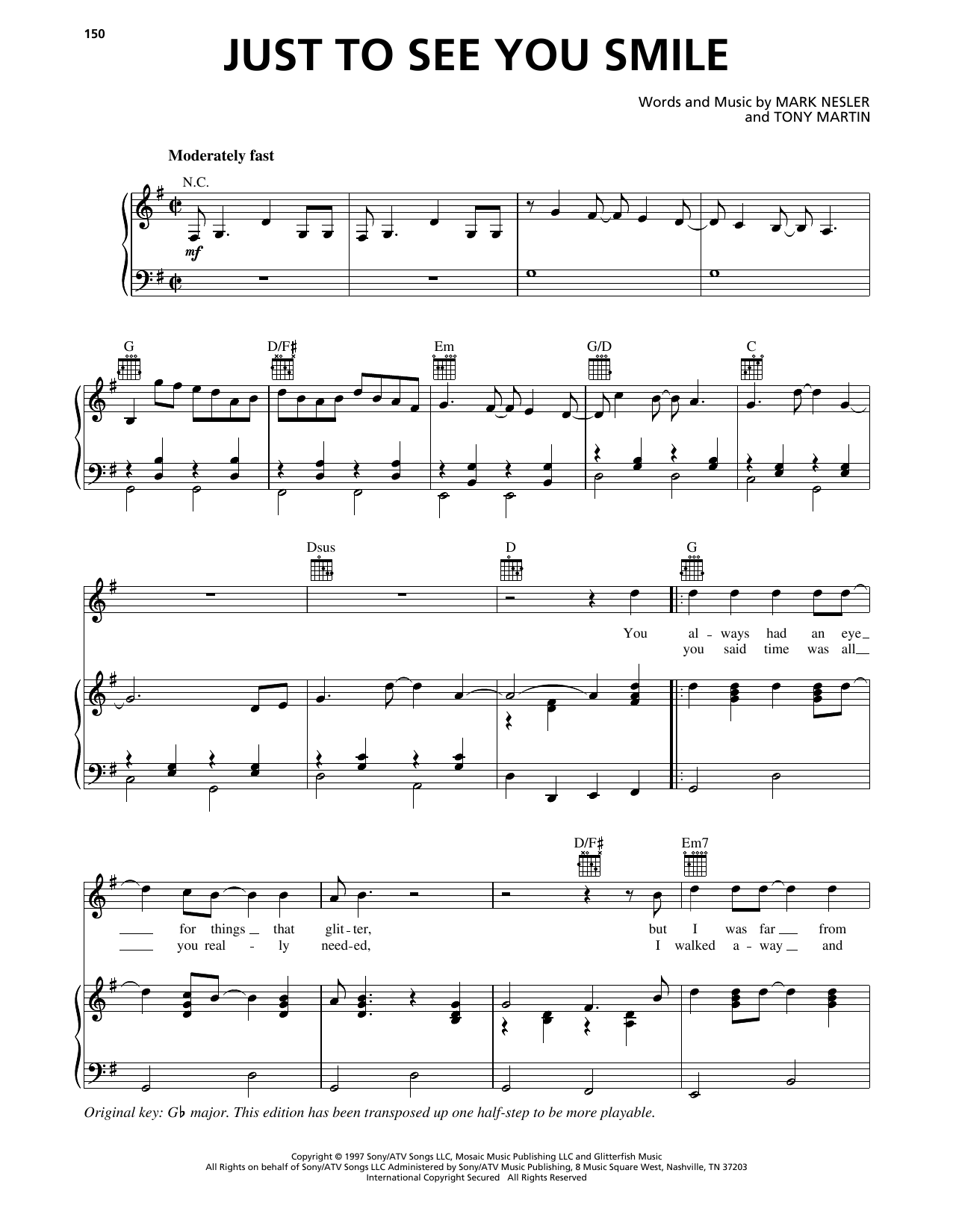 Download or print Tim McGraw Just To See You Smile sheet music, chords and digital score arranged for Piano, Vocal & Guitar Chords (Right-Hand Melody). This Country score includes 5 page(s).