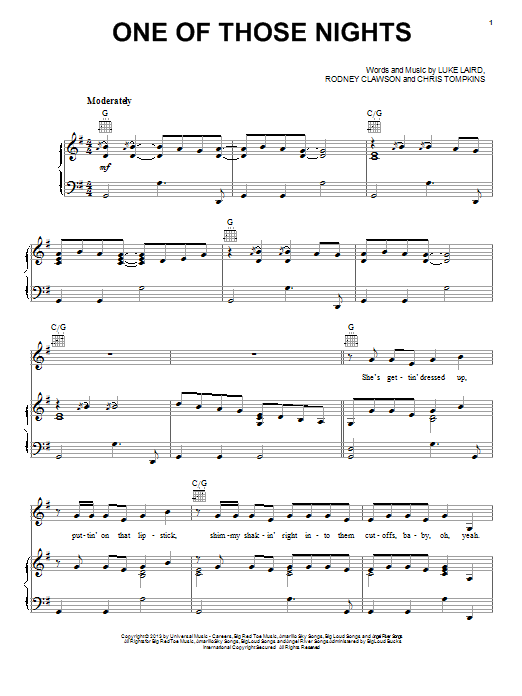 Download or print Tim McGraw One Of Those Nights sheet music, chords and digital score arranged for Piano, Vocal & Guitar Chords (Right-Hand Melody). This Pop score includes 8 page(s).