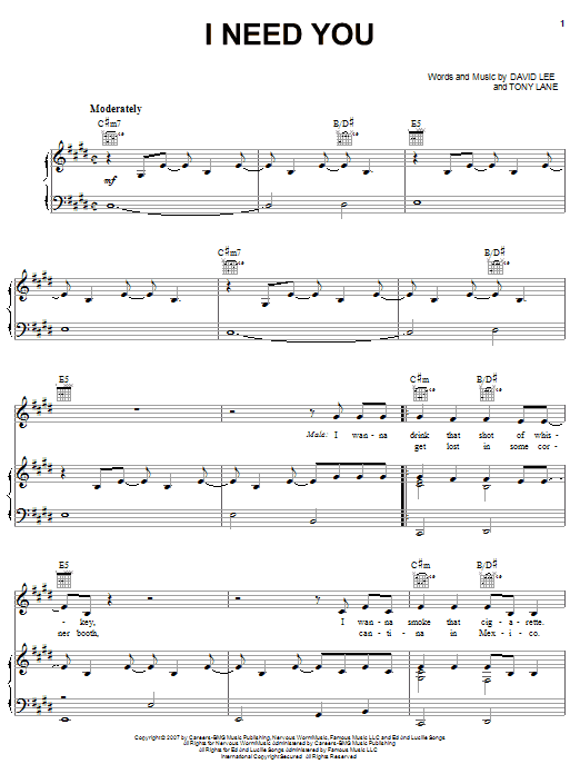 Download or print Tim McGraw with Faith Hill I Need You sheet music, chords and digital score arranged for Piano, Vocal & Guitar Chords (Right-Hand Melody). This Country score includes 7 page(s).