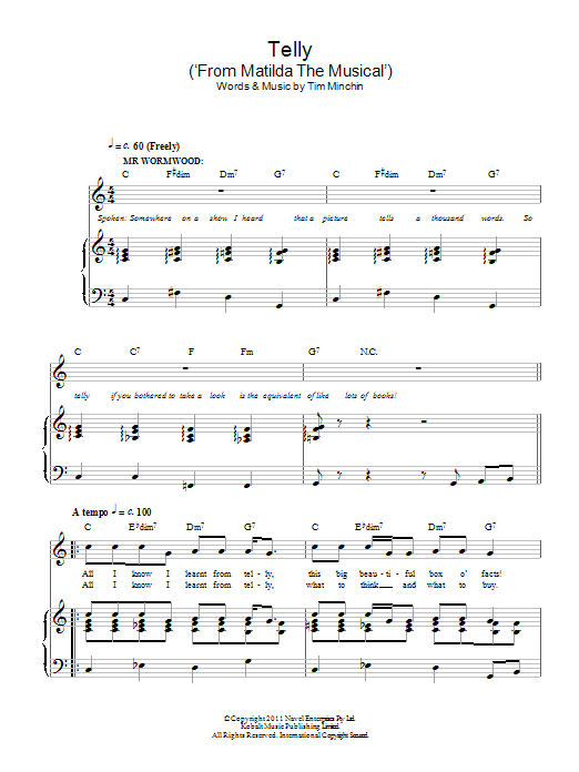 Download or print Tim Minchin Telly (from Matilda The Musical) sheet music, chords and digital score arranged for Piano & Vocal. This Musical/Show score includes 5 page(s).