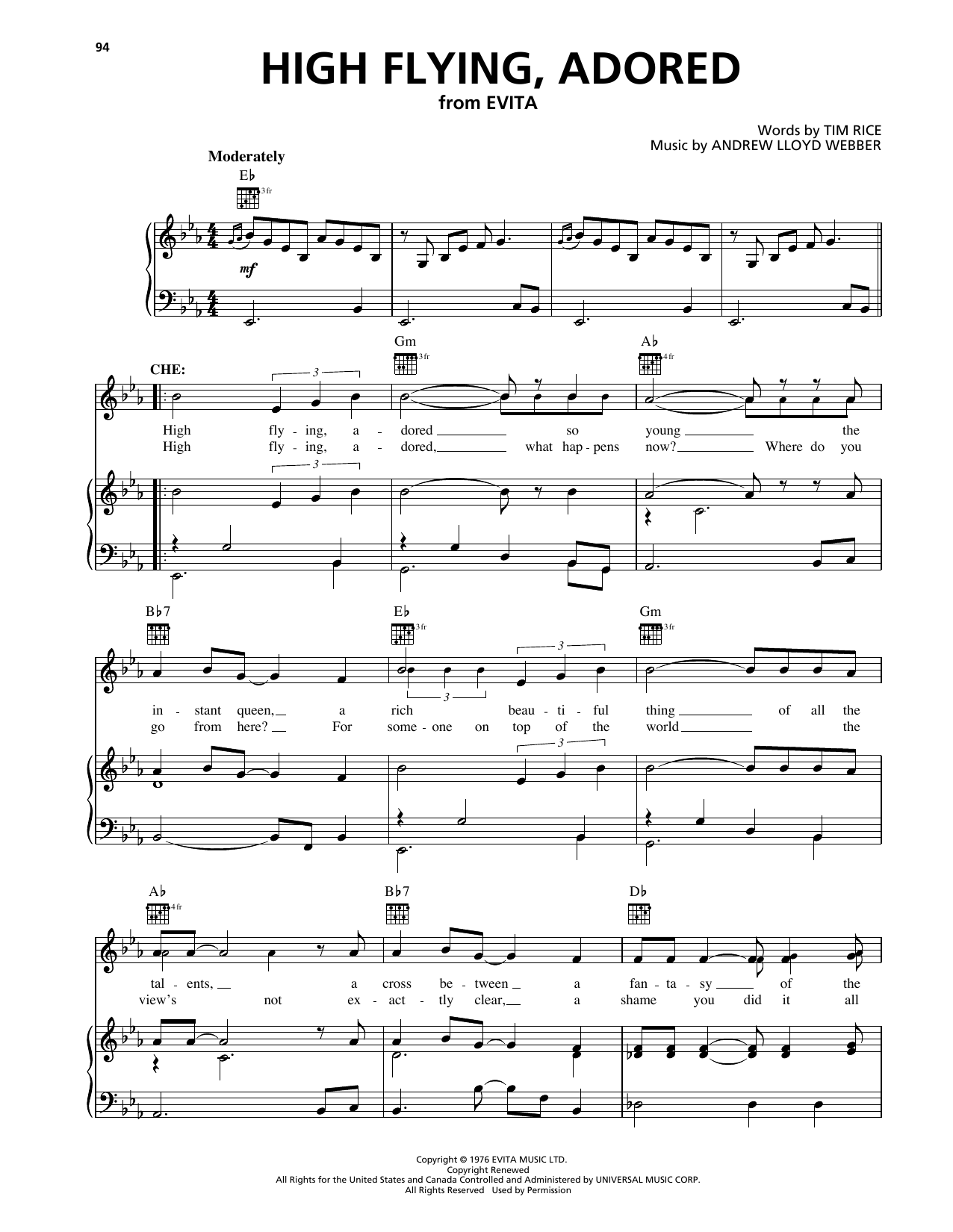 Download or print Tim Rice High Flying, Adored (from Evita) sheet music, chords and digital score arranged for Piano, Vocal & Guitar Chords (Right-Hand Melody). This Pop score includes 5 page(s).