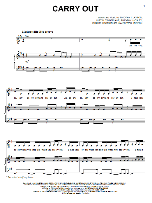 Download or print Timbaland featuring Justin Timberlake Carry Out sheet music, chords and digital score arranged for Piano, Vocal & Guitar Chords (Right-Hand Melody). This Hip-Hop score includes 9 page(s).