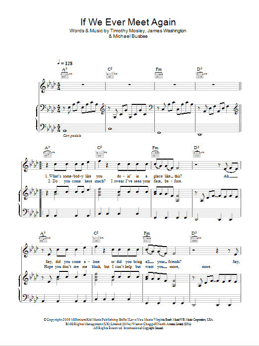 Download or print Timbaland featuring Katy Perry If We Ever Meet Again sheet music, chords and digital score arranged for Piano, Vocal & Guitar Chords. This Pop score includes 7 page(s).