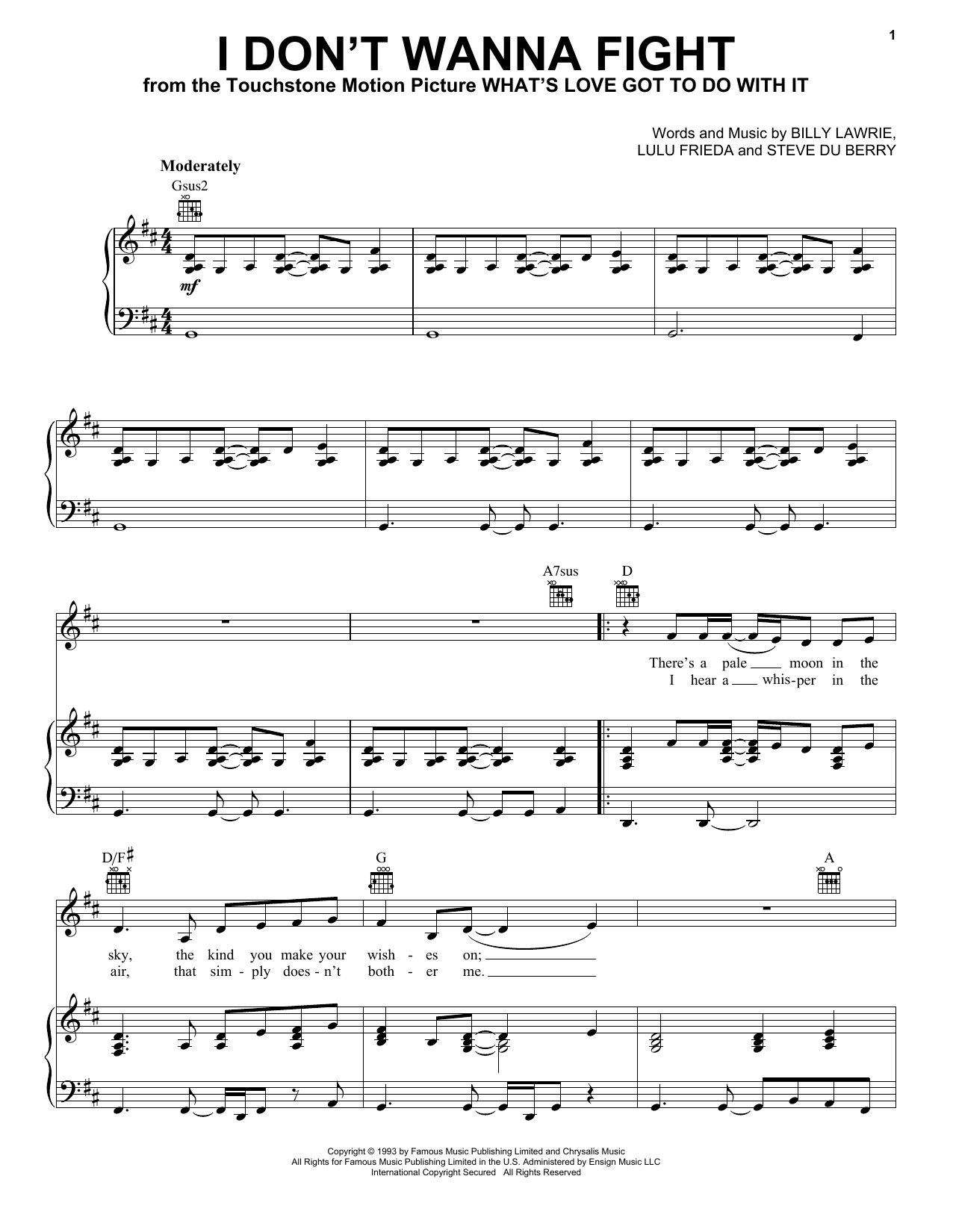 Download or print Tina Turner I Don't Wanna Fight sheet music, chords and digital score arranged for Lead Sheet / Fake Book. This Pop score includes 2 page(s).