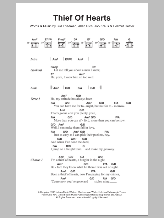 Download or print Tina Turner Thief Of Hearts sheet music, chords and digital score arranged for Guitar Chords/Lyrics. This Pop score includes 3 page(s).
