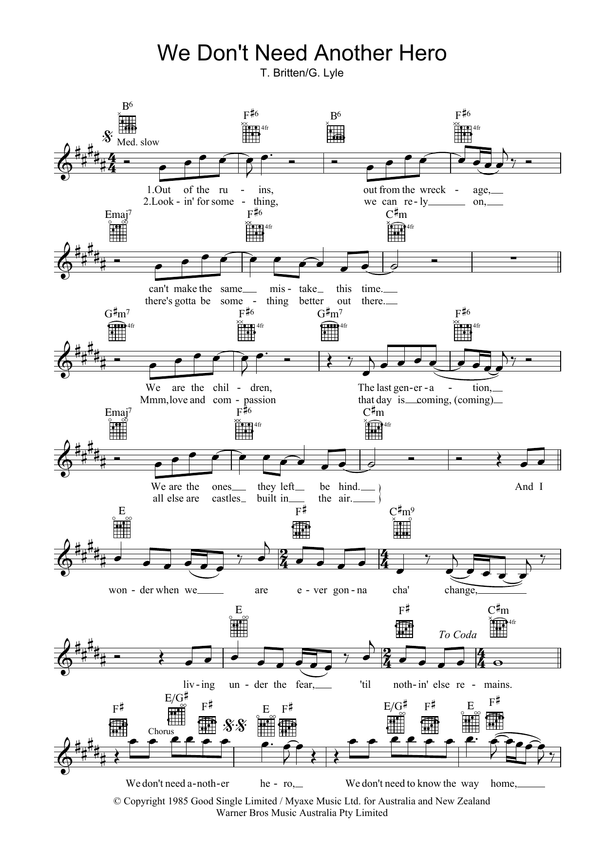 Download or print Tina Turner We Don't Need Another Hero sheet music, chords and digital score arranged for Piano, Vocal & Guitar Chords (Right-Hand Melody). This Pop score includes 5 page(s).