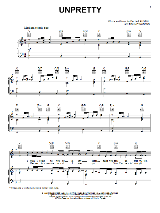 Download or print TLC Unpretty sheet music, chords and digital score arranged for Piano, Vocal & Guitar Chords. This Pop score includes 8 page(s).
