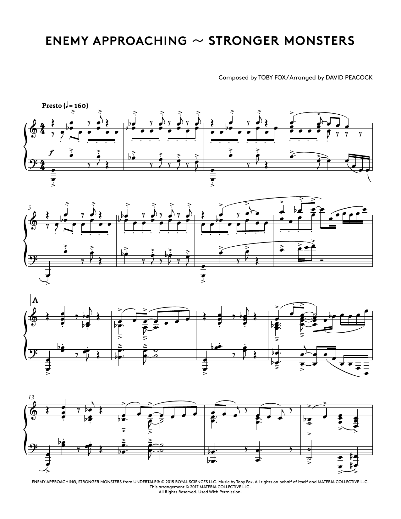 Download or print Toby Fox Enemy Approaching - Stronger Monsters (from Undertale Piano Collections 2) (arr. David Peacock) sheet music, chords and digital score arranged for Piano Solo. This Video Game score includes 6 page(s).