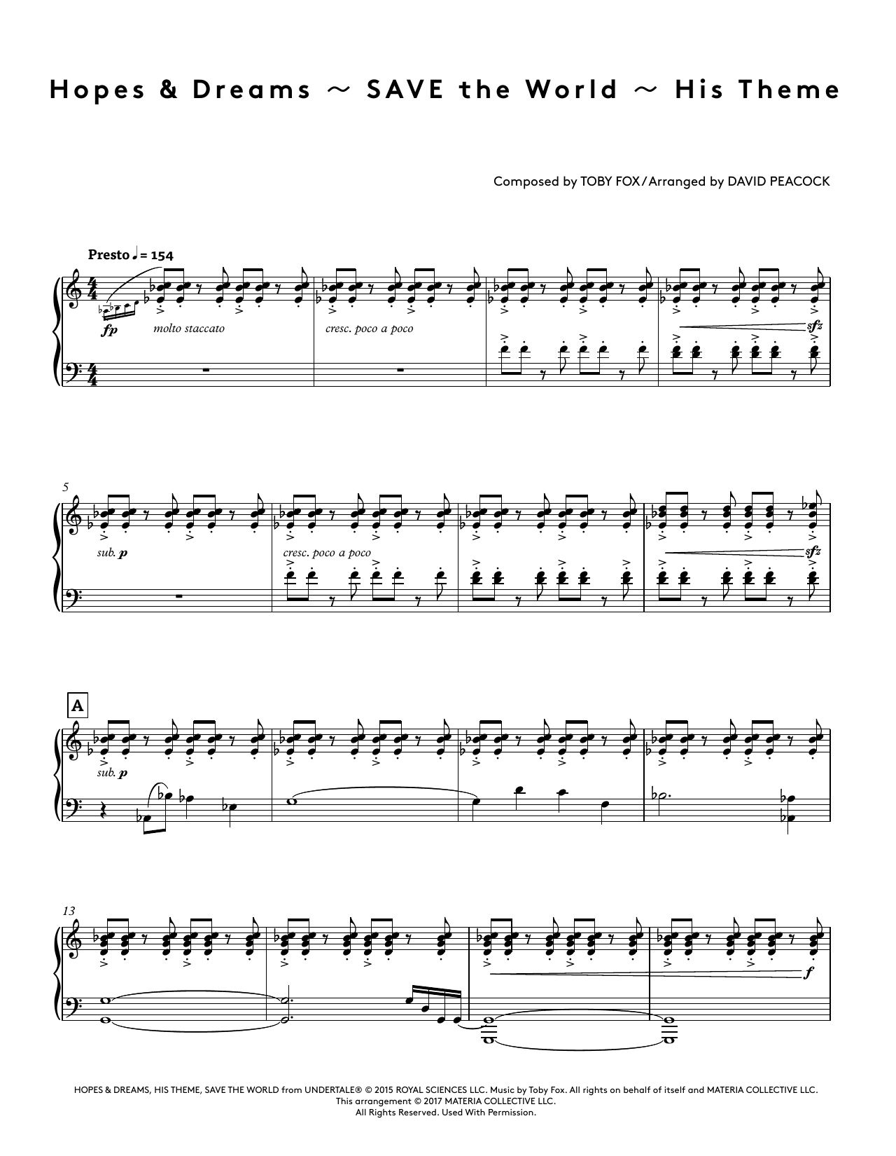 Download or print Toby Fox Hopes & Dreams - SAVE The World - His Theme (from Undertale Piano Collections) (arr. David Peacock) sheet music, chords and digital score arranged for Piano Solo. This Video Game score includes 12 page(s).