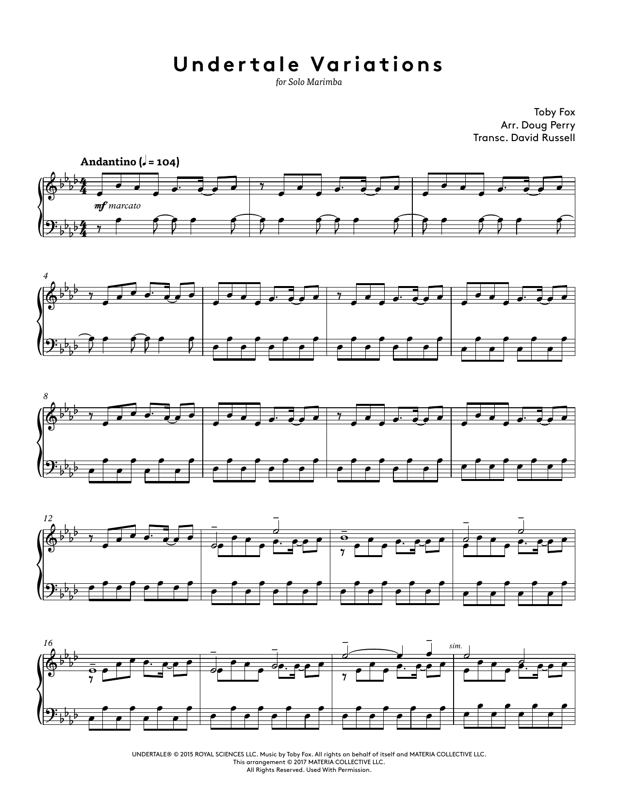 Download or print Toby Fox Undertale Variations (arr. Doug Perry) sheet music, chords and digital score arranged for Marimba Solo. This Video Game score includes 11 page(s).