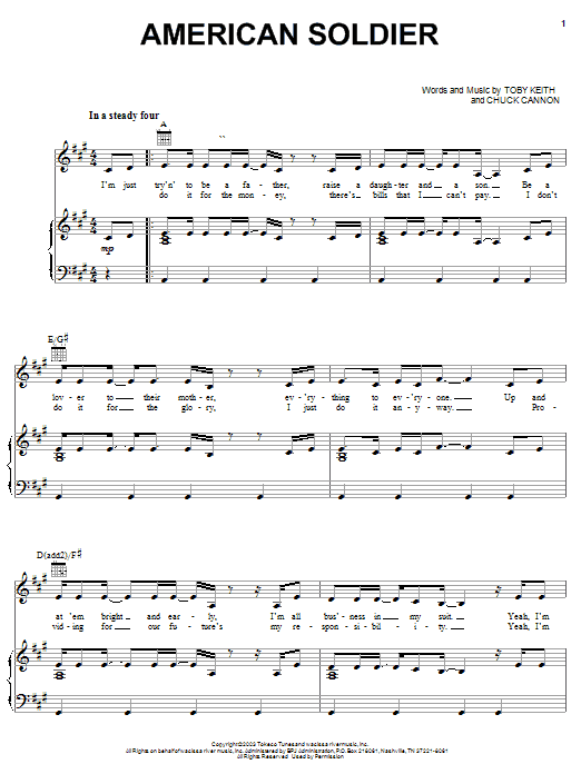 Download or print Toby Keith American Soldier sheet music, chords and digital score arranged for Piano, Vocal & Guitar Chords (Right-Hand Melody). This Country score includes 7 page(s).