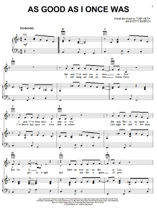 Download or print Toby Keith As Good As I Once Was sheet music, chords and digital score arranged for Piano, Vocal & Guitar Chords (Right-Hand Melody). This Country score includes 5 page(s).