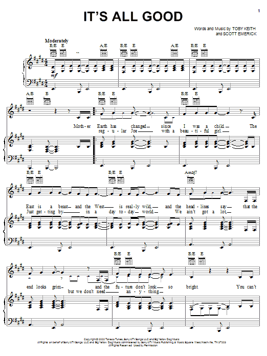 Download or print Toby Keith It's All Good sheet music, chords and digital score arranged for Piano, Vocal & Guitar Chords (Right-Hand Melody). This Country score includes 4 page(s).
