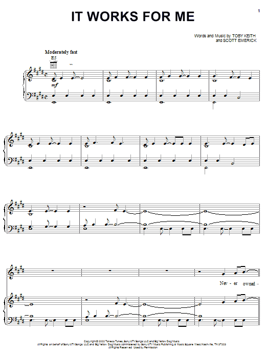 Download or print Toby Keith It Works For Me sheet music, chords and digital score arranged for Piano, Vocal & Guitar Chords (Right-Hand Melody). This Country score includes 6 page(s).