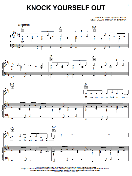 Download or print Toby Keith Knock Yourself Out sheet music, chords and digital score arranged for Piano, Vocal & Guitar Chords (Right-Hand Melody). This Country score includes 6 page(s).