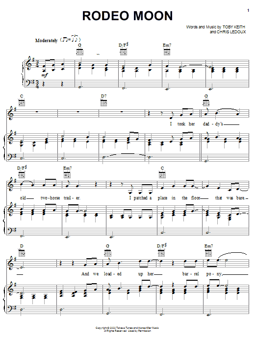 Download or print Toby Keith Rodeo Moon sheet music, chords and digital score arranged for Piano, Vocal & Guitar Chords (Right-Hand Melody). This Country score includes 6 page(s).