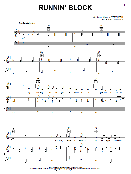 Download or print Toby Keith Runnin' Block sheet music, chords and digital score arranged for Piano, Vocal & Guitar Chords (Right-Hand Melody). This Country score includes 8 page(s).