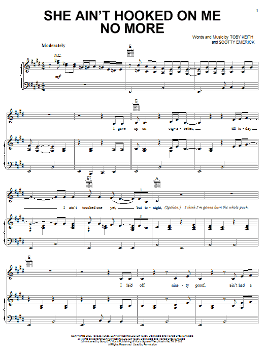 Download or print Toby Keith She Ain't Hooked On Me No More sheet music, chords and digital score arranged for Piano, Vocal & Guitar Chords (Right-Hand Melody). This Country score includes 6 page(s).