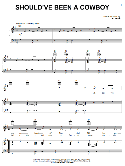 Download or print Toby Keith Should've Been A Cowboy sheet music, chords and digital score arranged for Big Note Piano. This Pop score includes 7 page(s).