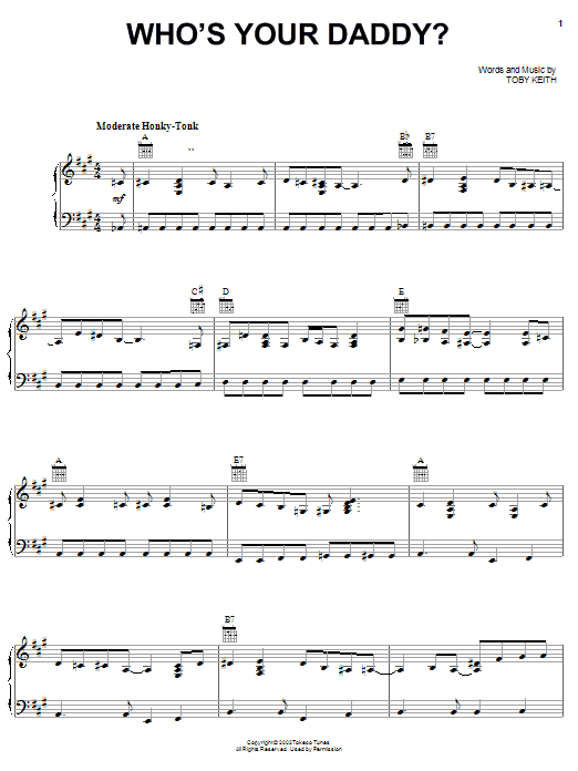 Download or print Toby Keith Who's Your Daddy? sheet music, chords and digital score arranged for Piano, Vocal & Guitar Chords (Right-Hand Melody). This Country score includes 6 page(s).