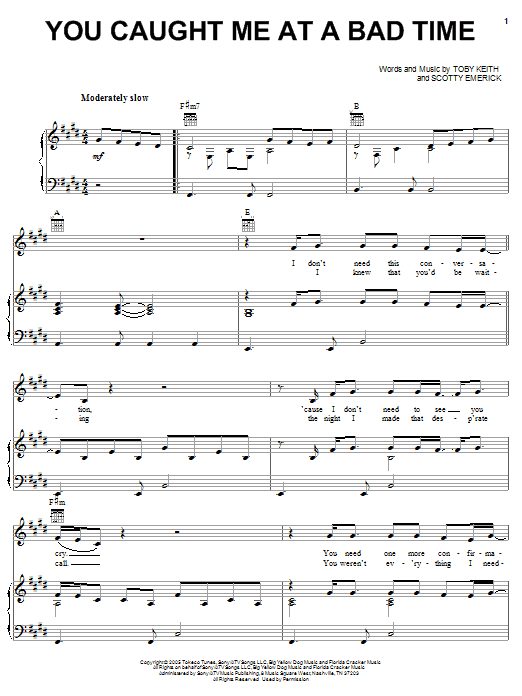 Download or print Toby Keith You Caught Me At A Bad Time sheet music, chords and digital score arranged for Piano, Vocal & Guitar Chords (Right-Hand Melody). This Country score includes 4 page(s).