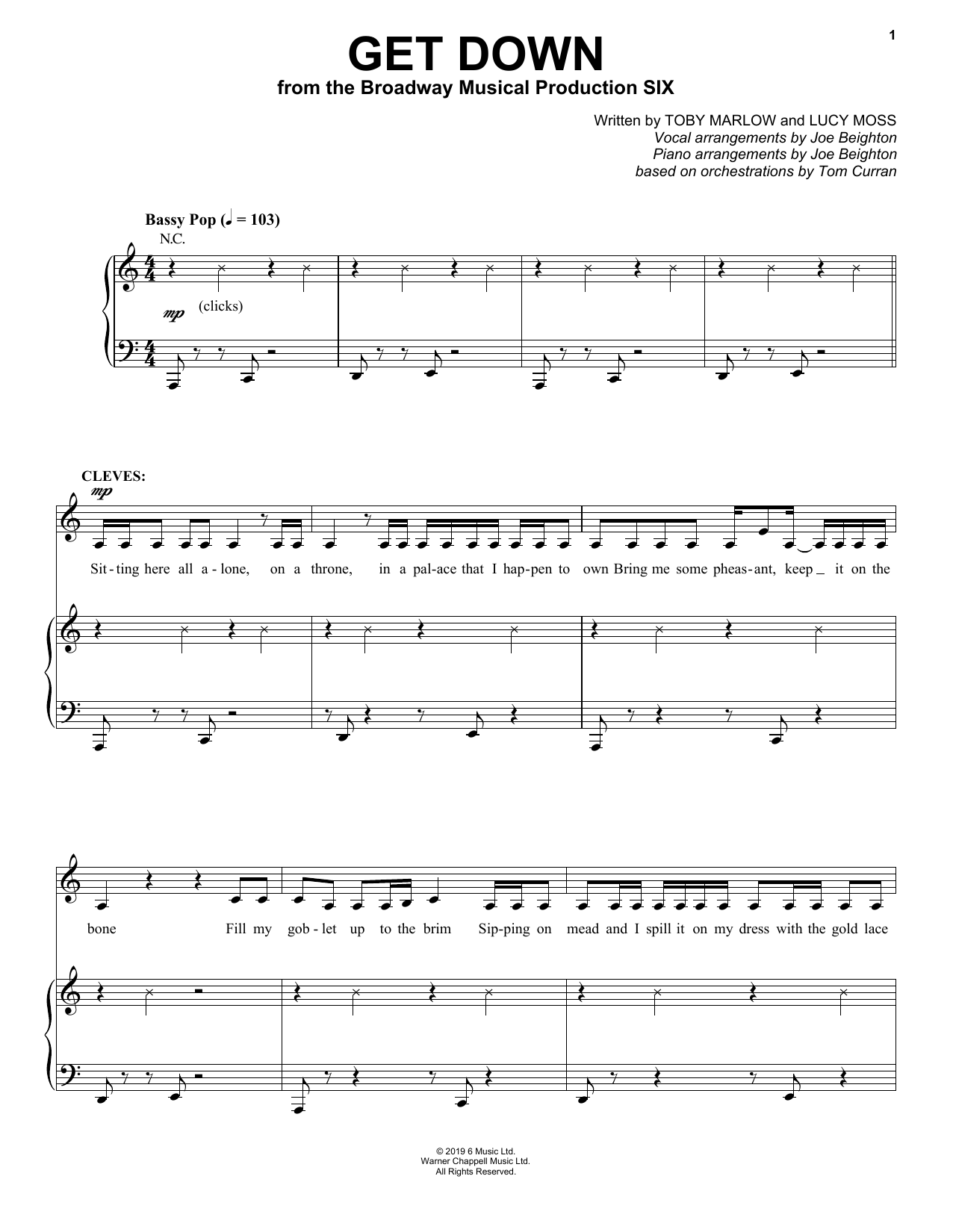 Download or print Toby Marlow & Lucy Moss Get Down (from Six: The Musical) sheet music, chords and digital score arranged for Piano & Vocal. This Musical/Show score includes 9 page(s).