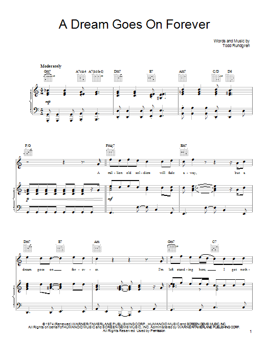 Download or print Todd Rundgren A Dream Goes On Forever sheet music, chords and digital score arranged for Piano, Vocal & Guitar Chords (Right-Hand Melody). This Pop score includes 5 page(s).