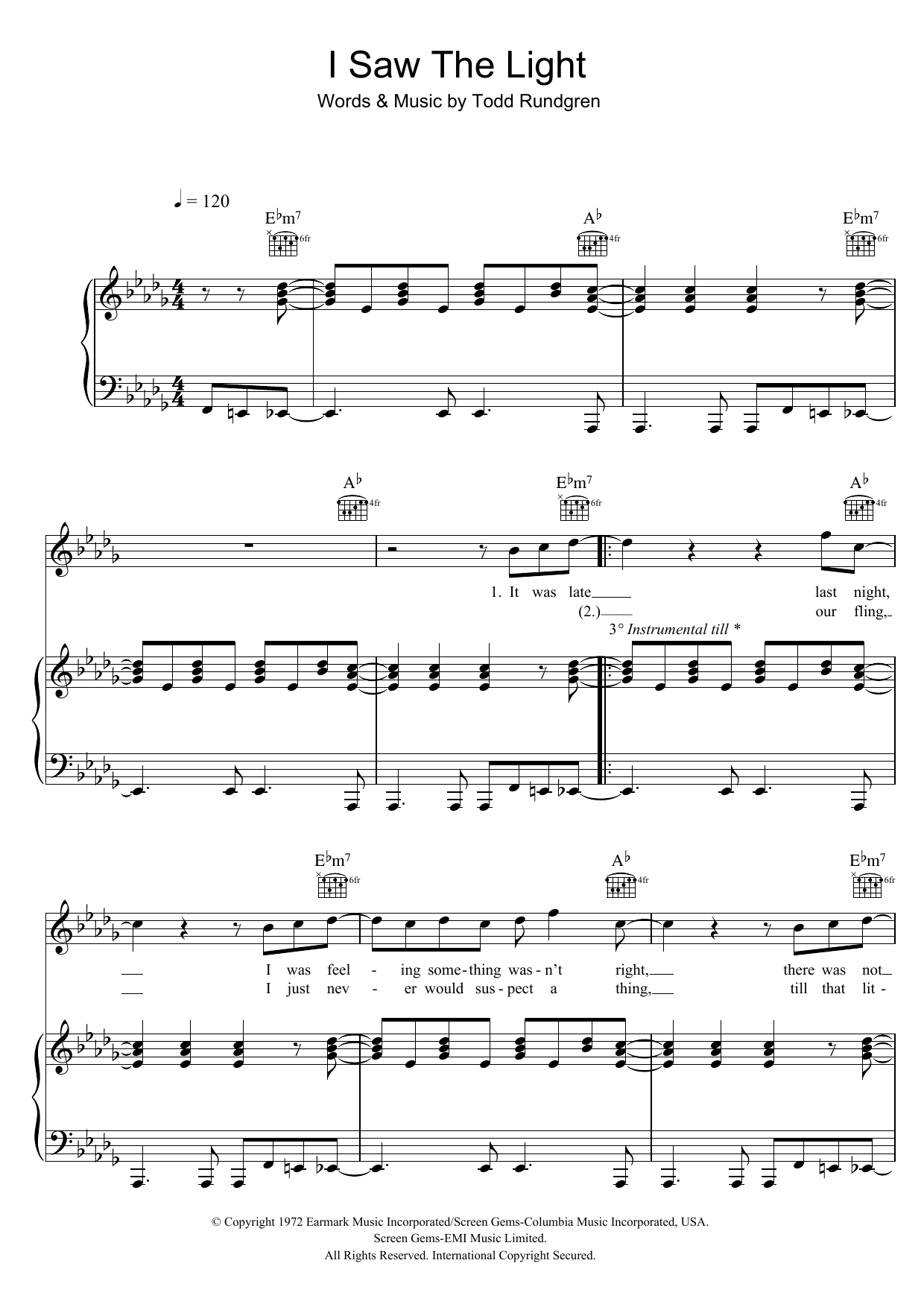 Download or print Todd Rundgren I Saw The Light sheet music, chords and digital score arranged for Guitar Chords/Lyrics. This Rock score includes 2 page(s).