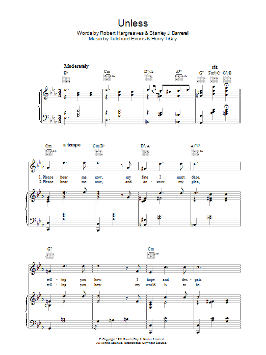 Download or print Tolchard Evans Unless sheet music, chords and digital score arranged for Piano, Vocal & Guitar Chords. This Standards score includes 4 page(s).
