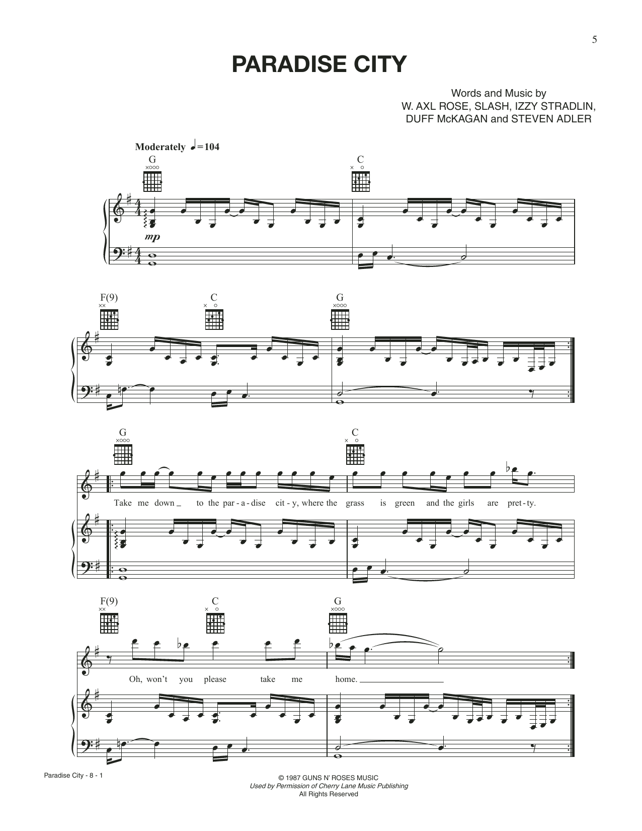 Download or print Tom Cruise Paradise City (from Rock Of Ages) sheet music, chords and digital score arranged for Piano, Vocal & Guitar Chords (Right-Hand Melody). This Rock score includes 8 page(s).