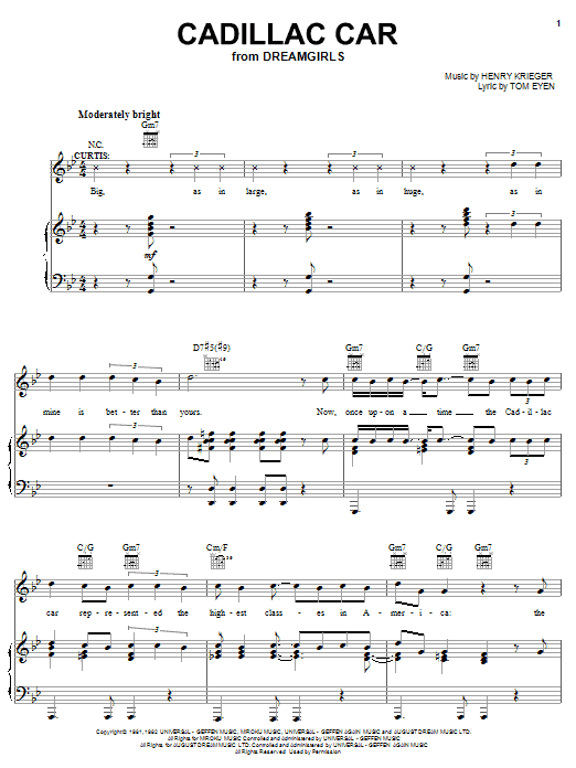 Download or print Tom Eyen Cadillac Car sheet music, chords and digital score arranged for Piano, Vocal & Guitar Chords (Right-Hand Melody). This Film/TV score includes 5 page(s).