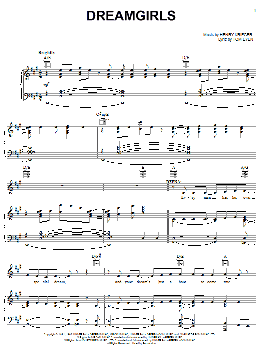 Download or print Tom Eyen Dreamgirls sheet music, chords and digital score arranged for Piano, Vocal & Guitar Chords (Right-Hand Melody). This Film/TV score includes 7 page(s).