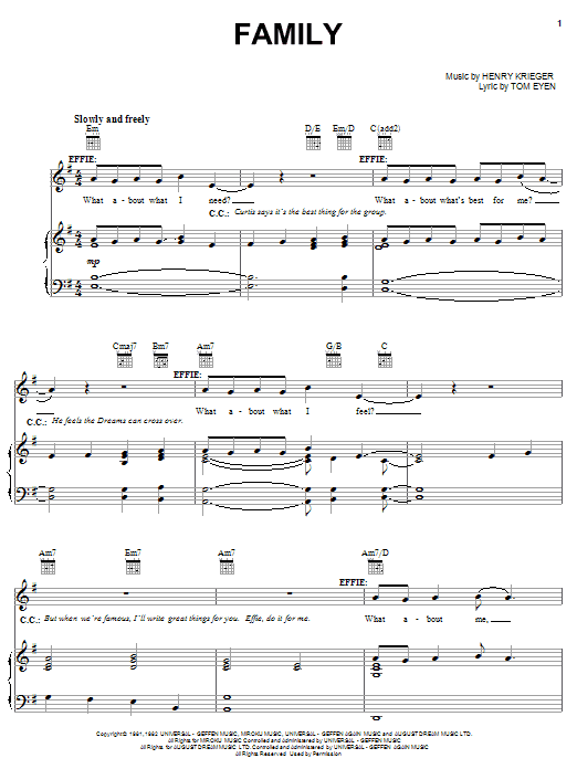 Download or print Tom Eyen Family sheet music, chords and digital score arranged for Piano, Vocal & Guitar Chords (Right-Hand Melody). This Film/TV score includes 6 page(s).