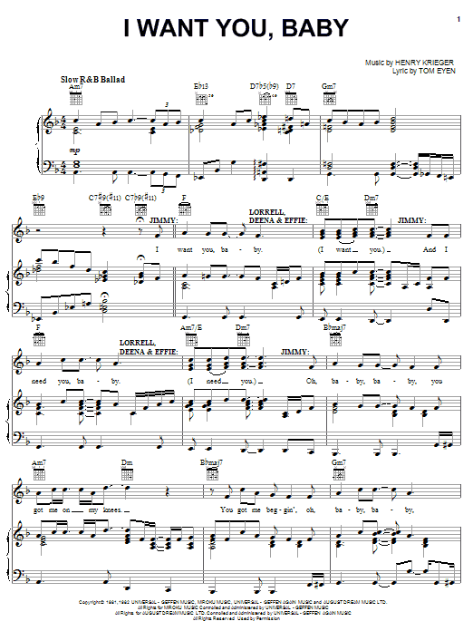 Download or print Tom Eyen I Want You, Baby sheet music, chords and digital score arranged for Piano, Vocal & Guitar Chords (Right-Hand Melody). This Film/TV score includes 4 page(s).