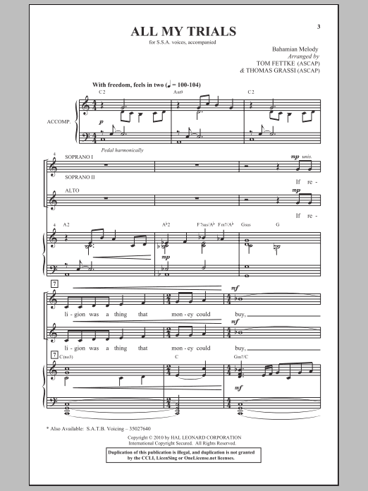 Download or print Tom Fettke All My Trials sheet music, chords and digital score arranged for SSA Choir. This Concert score includes 10 page(s).