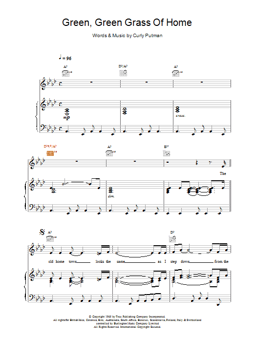 Download or print Tom Jones Green Green Grass Of Home sheet music, chords and digital score arranged for Piano, Vocal & Guitar Chords. This Country score includes 5 page(s).