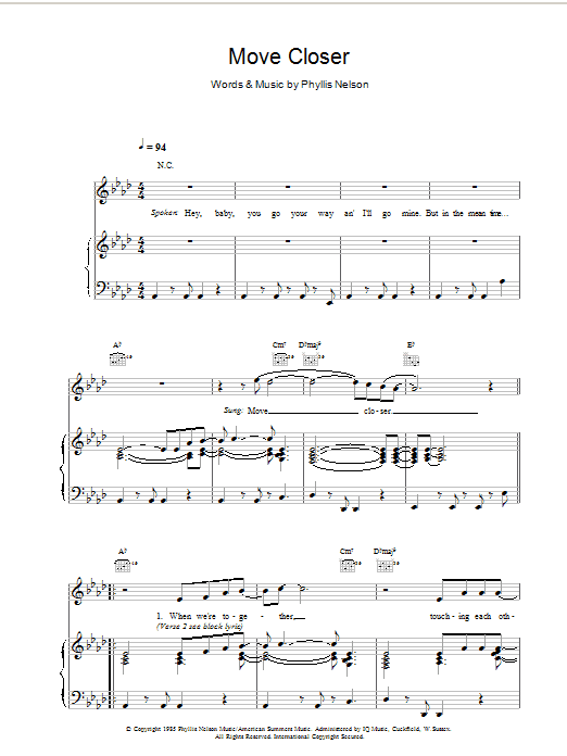 Download or print Tom Jones Move Closer sheet music, chords and digital score arranged for Piano, Vocal & Guitar Chords. This Pop score includes 5 page(s).