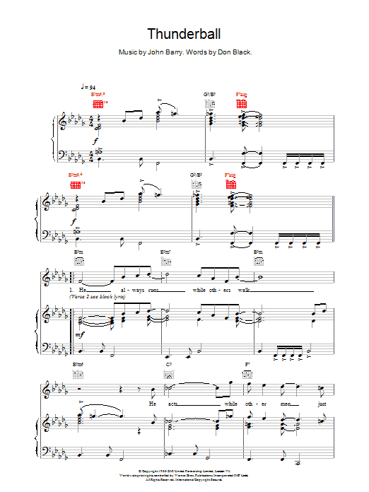 Download or print Tom Jones Thunderball sheet music, chords and digital score arranged for Piano, Vocal & Guitar Chords. This Pop score includes 4 page(s).