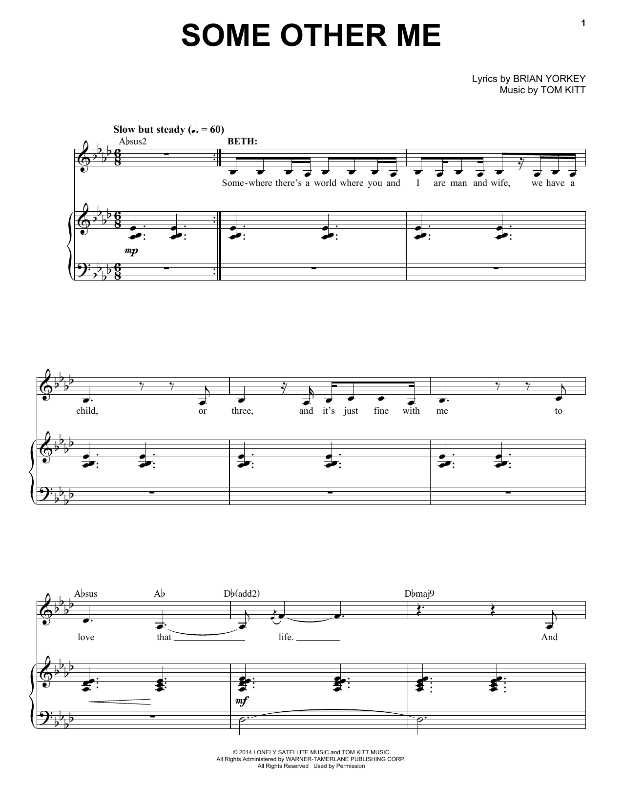 This composition is beautifuly arranged for Piano & Vocal includes 9 page(s). It is performed by Tom Kitt. The style of the score is 'Pop'. Catalog SKU number of the notation is 155168.