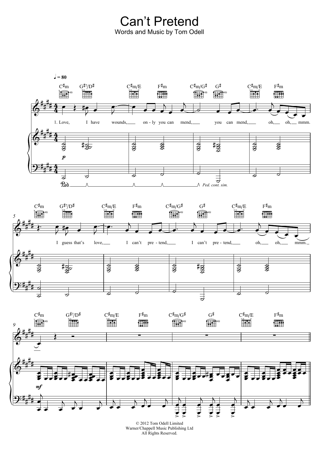 Download or print Tom Odell Can't Pretend sheet music, chords and digital score arranged for Piano, Vocal & Guitar Chords (Right-Hand Melody). This Pop score includes 6 page(s).