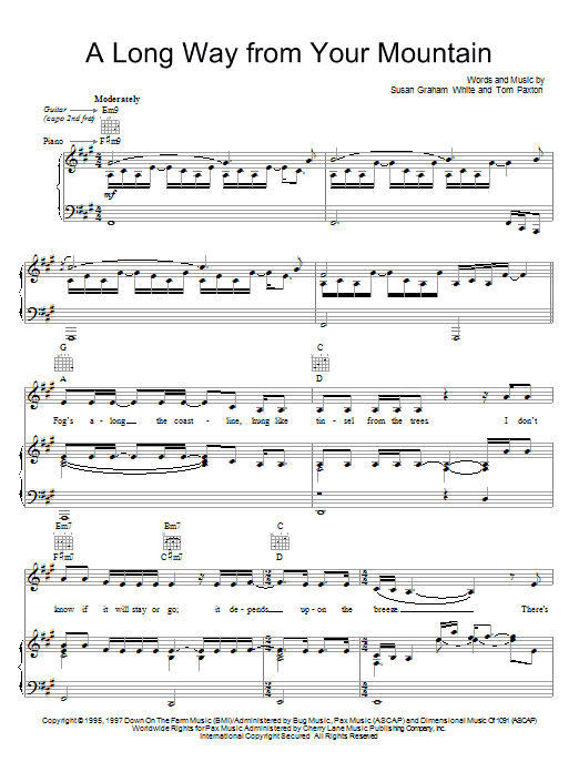 Download or print Tom Paxton A Long Way From Your Mountain sheet music, chords and digital score arranged for Piano, Vocal & Guitar Chords (Right-Hand Melody). This Country score includes 5 page(s).
