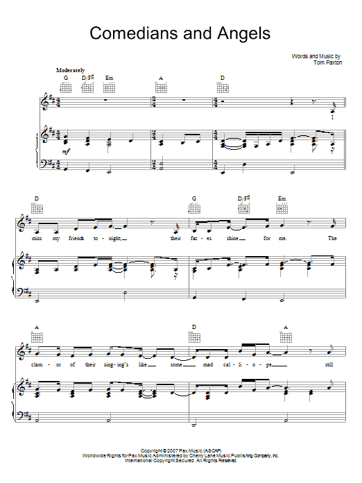 Download or print Tom Paxton Comedians And Angels sheet music, chords and digital score arranged for Piano, Vocal & Guitar Chords (Right-Hand Melody). This Country score includes 6 page(s).