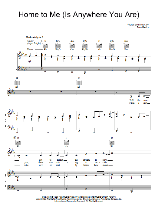 Download or print Tom Paxton Home For Me (Is Anywhere You Are) sheet music, chords and digital score arranged for Piano, Vocal & Guitar Chords (Right-Hand Melody). This Country score includes 5 page(s).