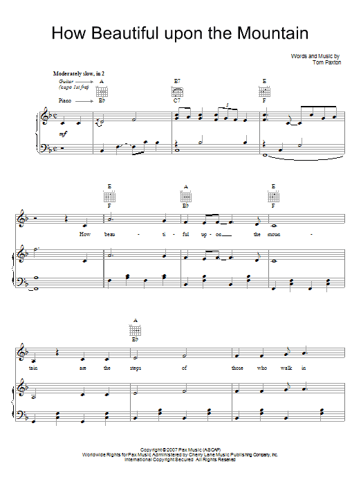 Download or print Tom Paxton How Beautiful Upon The Mountain sheet music, chords and digital score arranged for Piano, Vocal & Guitar Chords (Right-Hand Melody). This Country score includes 7 page(s).