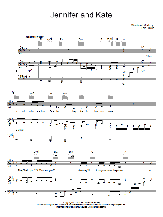Download or print Tom Paxton Jennifer And Kate sheet music, chords and digital score arranged for Piano, Vocal & Guitar Chords (Right-Hand Melody). This Country score includes 6 page(s).