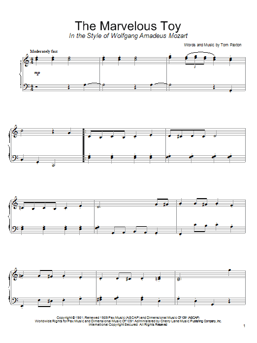 Download or print Tom Paxton The Marvelous Toy (in the style of Mozart) (arr. David Pearl) sheet music, chords and digital score arranged for Piano Solo. This Children score includes 3 page(s).