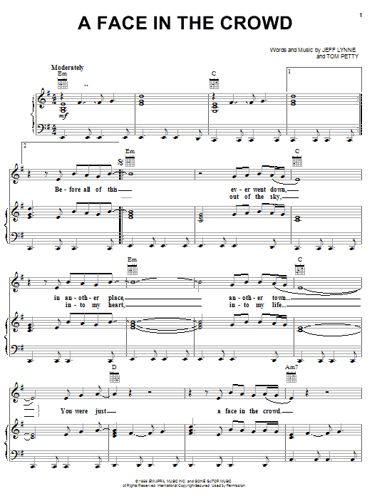 Download or print Tom Petty A Face In The Crowd sheet music, chords and digital score arranged for Piano, Vocal & Guitar Chords (Right-Hand Melody). This Pop score includes 3 page(s).